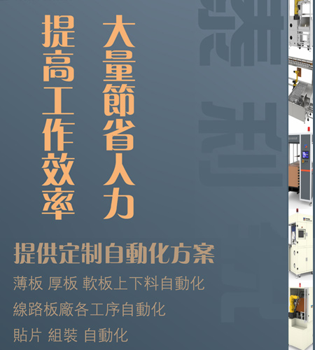 公司持續創新并研發鉆孔車間智能化自動上、下板系統;防焊車間預烘后自動上、下板系統。